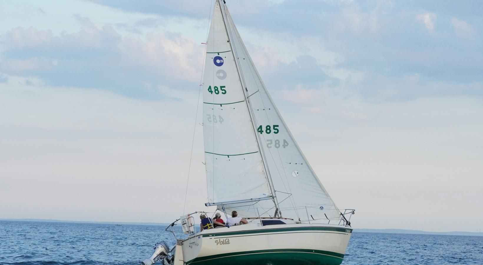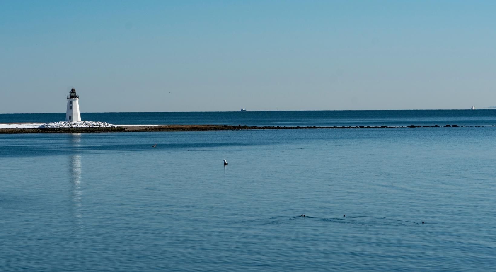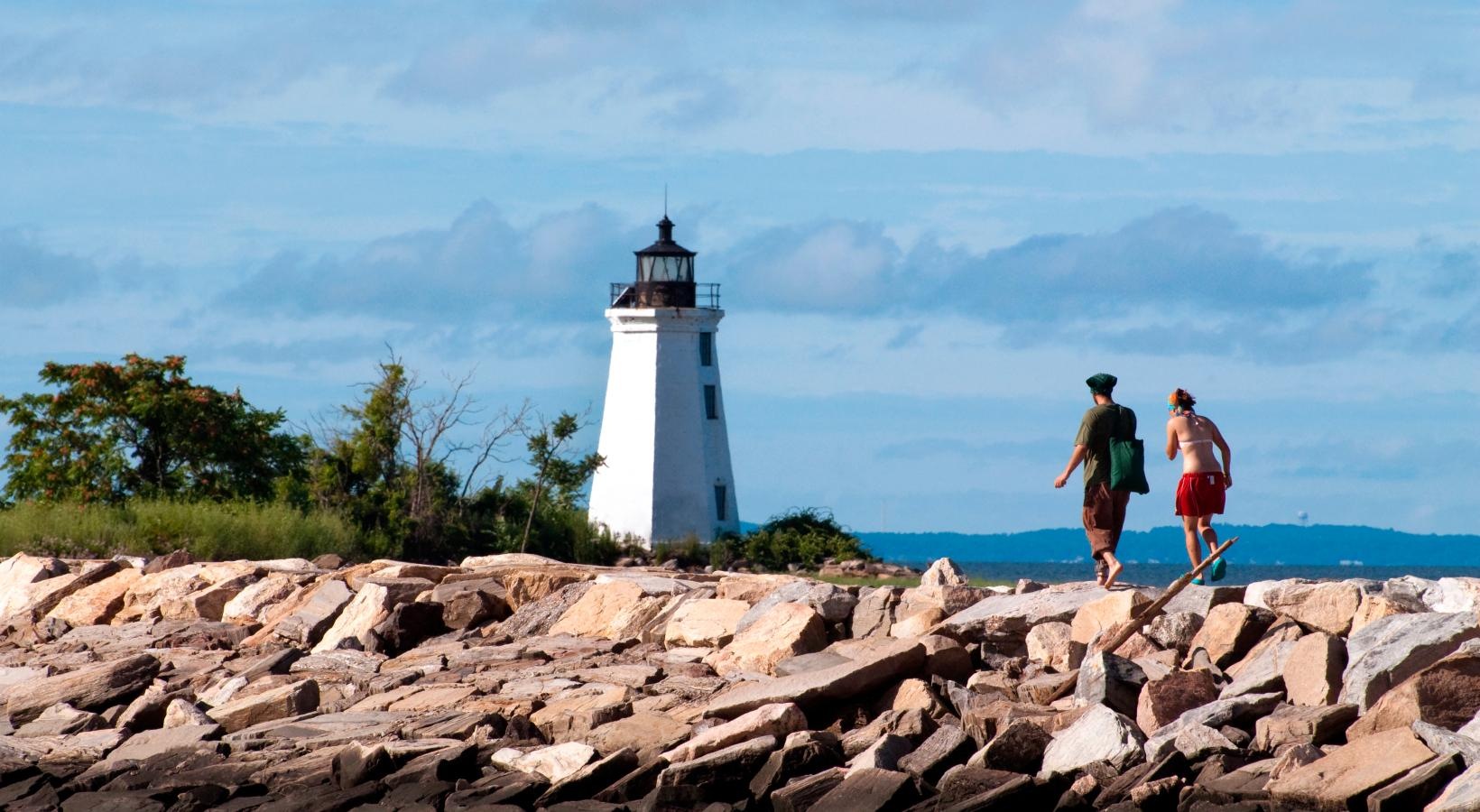 • two people walking on a rocky beach with Crisp Point Light in the background