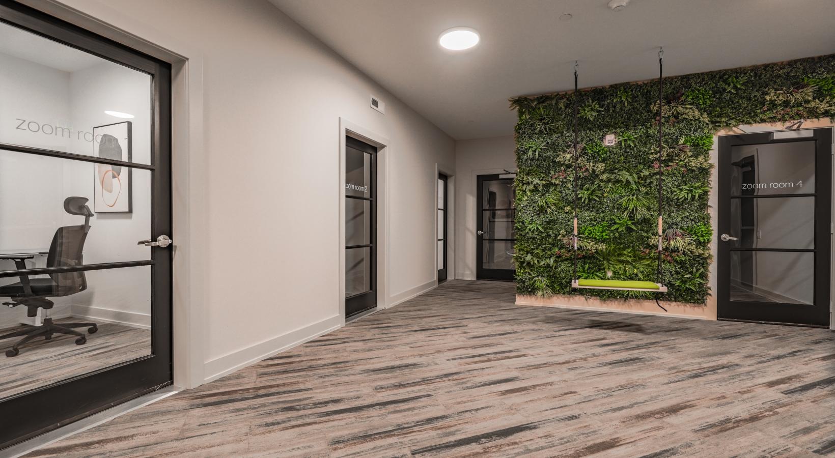 • a room with a wood floor and a wood floor with a door and a glass wall with a